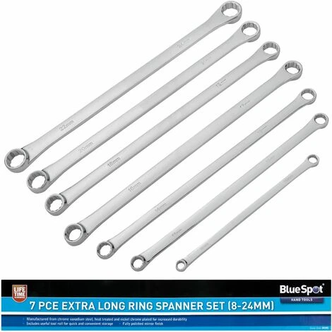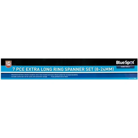 The BlueSpot 7PCE Extra Long Ring Spanner Set (8-24mm) is manufactured from chrome vanadium steel, heat-treated and nickel-plated for increased durability.