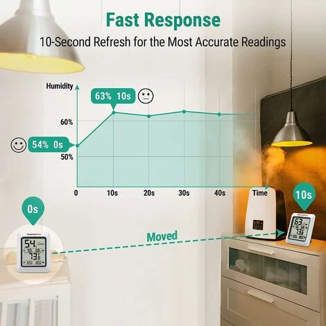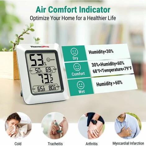 Air Comfort Indicator: This humidity meter with humidity level icon indicates air conditions – DRY/COMFORT/WET, allowing this humidity sensor to ensure you’re always aware of changes to your home/household with just a quick glance
