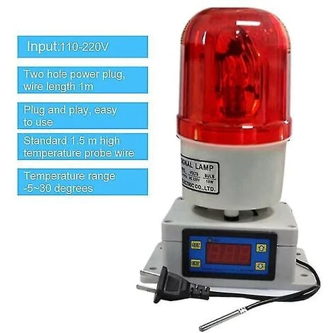 This alarm is easy to use, plug and play. Accurate measurement, alarm immediately after reaching alarm temperature, with alarm bell.Features:High decibel alarm.LEDs sound and light integrated.When the alarm temperature is exceeded, press any key on the thermostat to exit, effectively remove the continued alarm trouble.Large screen displays real-time temperature, high and low temperature alarm, upper/lower limit setting.This temperature control alarm uses M6 screw hole, easy installation.The power supply end adopts 2 inserted 1-meter wire, while the temperature sensing wire adopts 1.5-meter high temperature wire.Specifications:Item type: Temperature AlarmTemperature control range: -5~300 degreeTemperature control accuracy: 0.1 degreeScreen color: Red/Blue/GreenOutput capacity: 10A relaySensor: 1M NTC probe line B3435 10KWorking voltage: 110-220VPackage weight: 735g/1.62poundsPackage size: 230*115*94mm/9.05*4.52*3.7inchesPackage list:1 * Alarm1 * High temperature probe wire(1.5M)