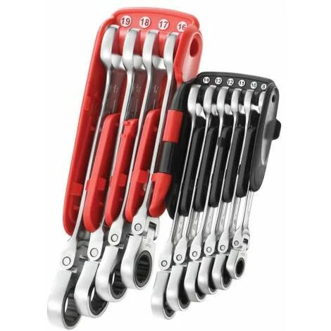 The Facom 467BF Ratchet Combination Wrenches are suitable for all applications. They feature an anti-slip open end for more productivity and safety, and a ring end that is hinged for ultimate access and comfort. The unique head design reduces the risk of rounding the fastener heads. The wrenches feature a compact ratcheting mechanism, which is reversible via a lever and offer a small recover angle of 5°. They have a satin chrome finish and come complete with a hinged case for storage and ease of transporting.