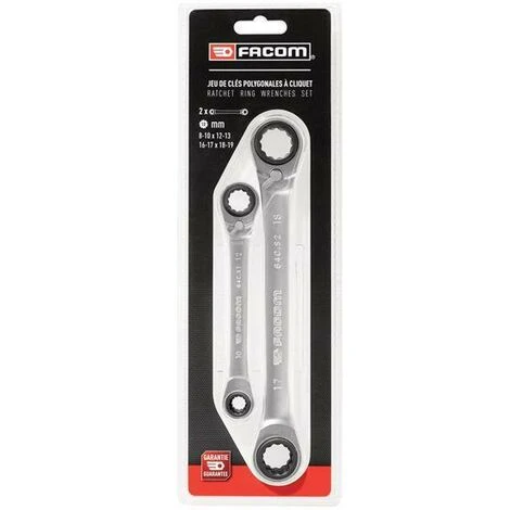 The Facom Quatro Ratcheting Spanner Set contains 2 multi-opening straight ratchet ring wrenches. Both have compact ratchet mechanisms with increments of 5° and are reversible via a lever. For added durability, they have a satin chrome finish. Supplied in a cardboard box.