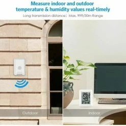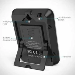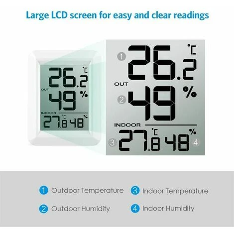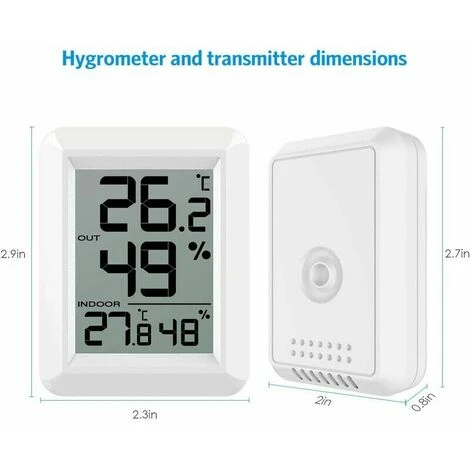 【Wide Transmission Range】Brifit thermometer hygrometer is connected to a radio transmitter that provides strong wireless signal penetration (433MHz frequency). The thermometer has a wide transmission range (30-100m/98-328ft) in the open area, the signal can be received quickly and in time in the transmission area. 【Multifunction】Brifit indoor and outdoor thermometer, for healthy living, measures indoor and outdoor temperature and humidity values. It is mainly used to measure temperature and humidity in homes, offices, workshops, etc. 【Accurate Reading & Large LCD Screen】Large LCD screen for easy and clear viewing. Indoor temperature (0-60°C/32-140°F)/outdoor temperature (-40°C-60°C/-40°F-140°F), humidity (10%-99%) and accuracy can reach ±1°C/±5% Sets data automatically every 60 seconds (about 30 minutes to stabilize the sensor) Fahrenheit. Please note that batteries must be reinstalled after changing °C/°F temperature units. 【Portable Design & 【Easy Installation】Wall mount indoor outdoor thermometer with retractable bracket on the back, easy to mount on the wall or put on the table. The digital hygrometer thermometer is an ideal life partner for your family. Note: To avoid permanent damage, be aware of battery polarity before inserting batteries. Never immerse the product in water, which will damage the product. Please change the Celsius/Fahrenheit unit first (default setting is Celsius) before inserting batteries. Please disassemble the batteries first to change the device when it is working. Do not clean the parts of the product with benzene, thinner, or other chemicals. If necessary, clean with a soft cloth. Replace the batteries if the screen goes dark. Specification: Indoor temperature: 0-60℃ / 32-140°F Outdoor temperature: -40℃ -60℃ / -40°F-140°F Humidity: 10%-99% Frame size: 7.5 x 5.8 x 1.9 cm LCD screen dimension: 5.2 x 4.1 cm Thermohygrometer transmitter: 6.8 x 5.0 x 2.0 cm Base station: 2 AAA 1.5V alkaline batteries (not included) Sensor Remote: 2 AAA 1.5V alkaline or lithium batteries (not included, use lithium batteries in cold weather and below -20°C)