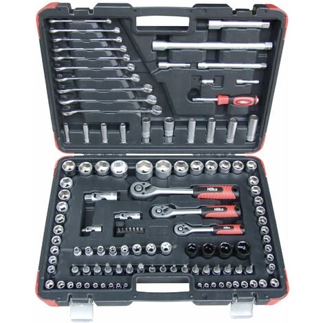 Chrome vanadium steel fully heat treated with wall drive sockets giving more torque and avoids damage to the nut. Satin chrome finish for durability. Quick release soft grip 72 teeth ratchet with spring loaded ball bearing in ratchet for secure fitment. 120pcs socket set chrome vanadium. Contents: 10pce 1/4Dr.6pt metric sockets:4,5,6,7,8,9,10,11,12,13mm 10pce 1/4Dr.6pt SAE sockets:5/32,3/16,7/32,1/4,9/32,5/16,11/32,3/8,7/16,1/2 4pce 1/4Dr.deep wall sockets 8,9,10,11mm 1pce 1/4 Dr. extension bar 2 1pce 1/4 Dr.universal joint 1pce 1/4Dr.coupler 1pce 1/4 Dr.spinner handle 1pce 1/4 Dr. quick release ratchet handle 7pce 1/4Dr.25mm bits Torx:T10,T15,T20,T25,T27,T30,T40 11pce 3/8Dr.6pt metric sockets 9,10,11,12,13,14,15,16,17,18,19mm 7pce 3/8Dr.6pt SAE sockets 3/8,7/16,1/2,9/16,5/8,11/16,3/4 4pce 3/8Dr.deep wall sockets:13,14,15,17mm 8pce 3/8Dr.E-sockets E8,E10,E11,E12,E14,E16,E18,E20 2pce 3/8Dr.extention bar 3&6 1pce 3/8Dr.universal joint 2pce 3/8Dr.spark