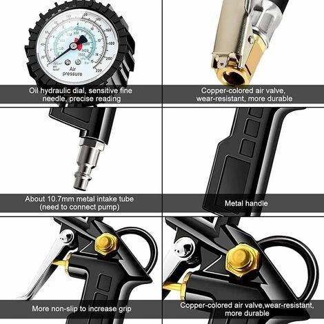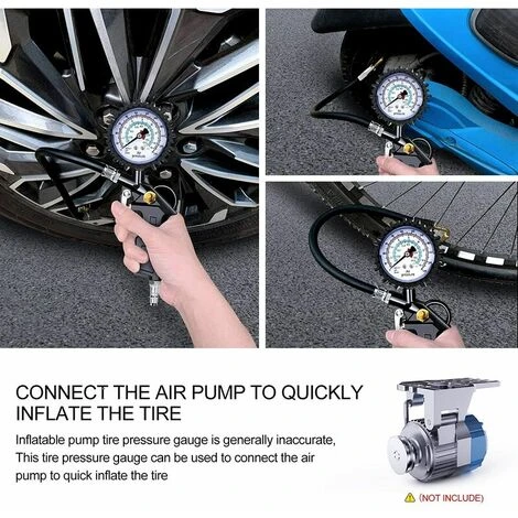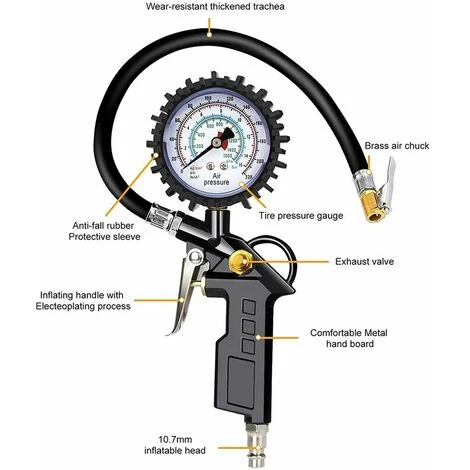 Multifunction Gauge: Tire Pressure Gauge 4 kinds of different units (PSI, BAR, KG/CM2, KPA) freely switchable.Product Accessories: Tire Pressure Gauge include,Valve Caps*4,Spare O-Ring* 2,Conversion nozzle *1,Valve core Screwdriver *1,Roll of PTFE sealing tape *1,Cone inflation adapter *2,90 degree valve extender *1,Inflation needle *1,Cork Metal Valve *1,Steel Connection 1/4 NPT (EU standard) *1; Several accessories meet all your needs. Easy to Use: Firmly connect the air chuck with the tire valve, and turn on the inflator gun, it will show the pressure. Just press the pressure relief button, it will deflate; Connect an air compressor and pull the trigger, it will inflate. Strong and Sturdy: High quality material. Thick rubber tube to ensure the digital car tire inflator is sturdy and durable. The exterior of the barometer has a rubber sheath that is shock, corrosion and drop resistant . Convenient and Quick: Pistol grip control handle and portable size is ideal for storage in the car and easy to use. Inflator Gun And is suitable for all vehicles such as Cars, SUVs, Trucks, Semi-Autos, RVs, Bicycles, Lawn Mowers, All-Terrain Vehicles, Race Cars, Pedal Go-Karts, Electric Vehicles, Bicycles.</ p>