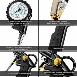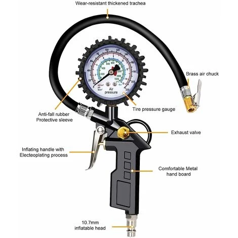 Solid and Sturdy: High quality material. Thick rubber tube to ensure the car tire inflator is sturdy and durable. The exterior of the barometer has a rubber sheath that is resistant to shocks, corrosion and falls.
