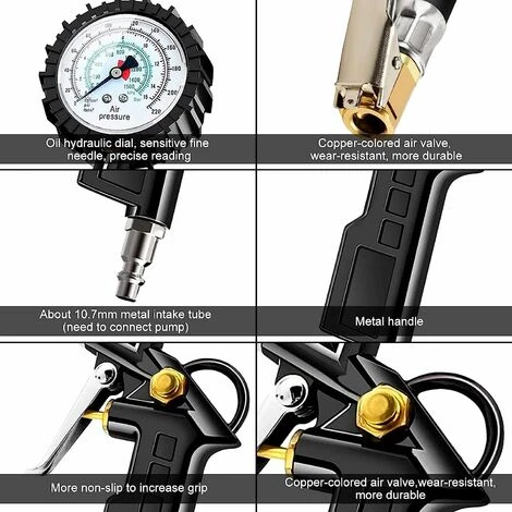 Easy to Use: Firmly connect the air chuck with the tire valve, and turn on the inflator gun, it will show the pressure. Just press the pressure relief button, it will deflate; Connect an air compressor and press the trigger, it will inflate.