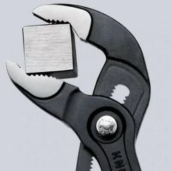 The Knipex 180mm Cobra High-tech Water Pump Pliers from ITS are impressively strong and tough, despite its size. The pliers are easily adjusted thanks to a button on the side for finer adjustments. This ensures the optimal adaptation to various sizes of work pieces. The pliers are self locking when working with pipes and nuts. The result delivers no slippage against the work piece. It also ensures minimal effort is required to work. The jaws gripping surface is serrated with special hardened teeth that are rated to approx. 61 HRC. They are resistant to high wear and tear yet offer stable gripping. The pliers are made from chrome vanadium electric steel, which has been forged and multi stage oil-hardened. The box-joint design results in high stability and also includes a pinch guard to prevent your fingers being caught.