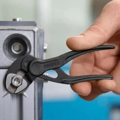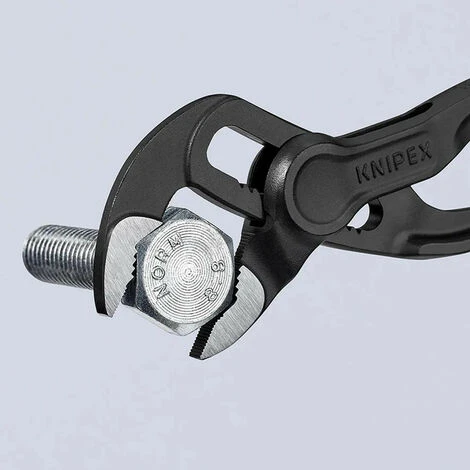 The Knipex Cobra XS Water Pump Pliers from ITS are small… We mean really small. Only 100mm long! If you’re working in a really small area and space is incredibly limited, these are perfect. With 11 adjustment positions that can grip nuts up to 24mm diameter or pipes up to 28mm in diameter, this offers all the versatility and flexibility of its bigger brothers in the Cobra range. The pliers are self locking on pipes and nuts which results in no-slipping on the workpiece and as a result a low force is required. The gripping surfaces have special-hardened teeth with a rating of 60 HRC approx. The hinged-joint design gives the use a high-level of stability thanks to the double guide while the pinch guard protects user fingers. Unlike pliers with mounted joints, no tilting forces arise when under strain. The handles stabilise each other in the joint.