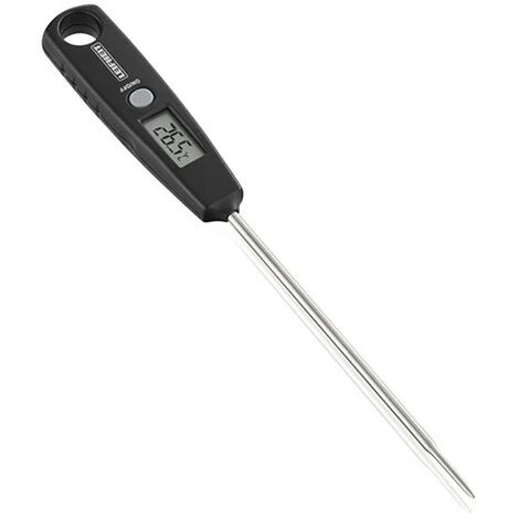 Handy, digital meat thermometer with stainless steel sensor allows precise cooking and frying