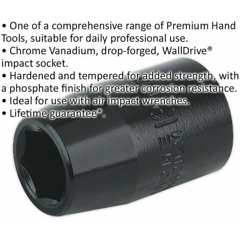 Chrome Vanadium, drop-forged, WallDrive® impact socket. Hardened and tempered for added strength, with phosphate finish for greater corrosion resistance. Ideal for use with air impact wrenches.