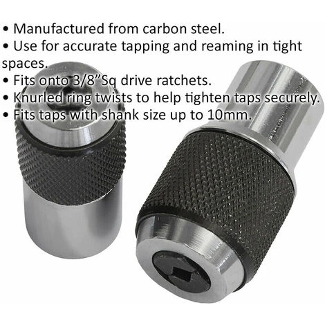 Manufactured from carbon steel. Use for accurate tapping and reaming in tight spaces. Fits onto 3/8″Sq drive ratchets. Knurled ring twists to help tighten taps securely. Fits taps with shank size up to 10mm.