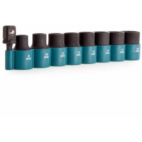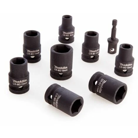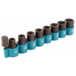 Makita B-54645 1/2 impact socket set with sockets 8, 10, 12, 13, 14, 15, 17 and 18 mm along with a 1/4 Hex to 1/2 Square converter – ideal for use with Impact Drivers as well as Impact Wrenches.