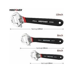 Manufacturer âMAXPOWER Part Number âMXP46 Product Dimensions â27 x 8 x 5 cm; 820 Grams Item model number âMAXPOWER Size â150mm, 200mm and 250mm-3PCs Colour âBlack Style âAdjustable Finish âPolished Material âChrome Vanadium Steel Torque â520 Newton Meters Item Package Quantity â1 Head Style âC Shaped Batteries included? âNo Batteries Required? âNo Item Weight â820 g MAXPOWER Adjustable Wrench Set, Shifter Movable Spanners Set with Soft Grip Handle