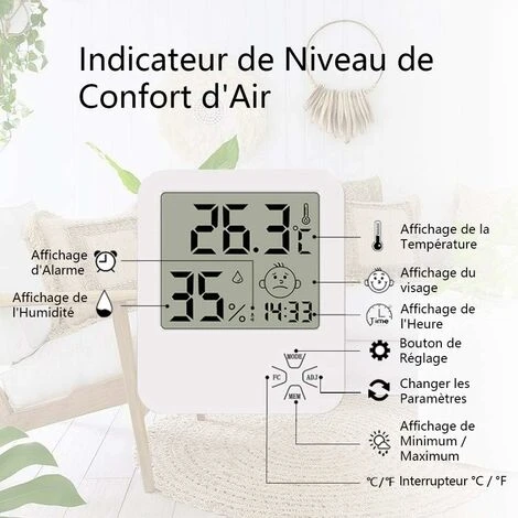 Multi-Function: This room thermometer has a clock function, Alarm clock and has and simple ° C / ° F switching and recording of minimum / maximum temperature and humidity. The optional 12 hour / 24 hour display system. LCD screen large enough for easy reading.