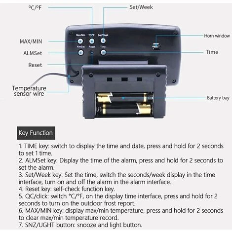 The screen displays the time, alarm clock, indoor and outdoor temperature, temperature trend, calendar, frost alarm. The alarm clock shows the health to wake up the cortex. The display of the time can be switched between 12 o’clock and