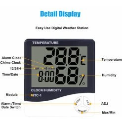 Alarm Clock Function – The humidity meter also displays the exact date and 12H/24H time, and with hourly chime function and alarm clock function, press the MODE key for a while then press the key ADJ can adjust.