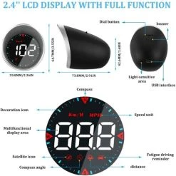 ă2.4 inch LCD screenăThis mini HUD has a 2.4 inch screen with Full HD display. The integrated light sensor allows the head-up display to automatically adjust the brightness. depending on the environment. This car HUD integrated to the sun visor can help you Read vehicle data more clearly without double shadow, including driving speed, satellite count, driving distance, driving direction, speed alert, fatigue alert, etc. . Freely switch between KMH and MPH. <br>ăDESIGNED FOR ALL VEHICLESăHigh quality and long life. The chip guarantees operation at any time. high speed from memory to dual-execution and dual-core processor with performance and compatibility high. Compatible with all cars, trucks, motorcycles and bicycles on the market. A versatile tool to help you understand your driving.