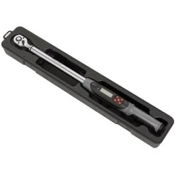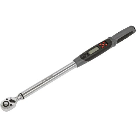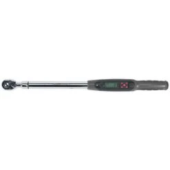 Rugged and resilient digital torque wrench suitable for workshop and factory use. LCD read-out with LED, vibration and audible alarms to indicate achieved and target torque levels. Features angle mode, eliminating the need for angle gauges and protractors providing an accurate and fast way to measure torque plus angle tightening sequences. Will also accumulate angle measurement when multiple turns are required, ideal for use where access is limited. Selectable track or peak modes and up to five user preset memories available. Read-outs in Nm, lb.in, lb.ft, kgf.m or degrees. Reversible Chrome Vanadium 72-tooth ratchet allows torque reading in either direction. Accurate to ñ2% of wrench?s stated capacity. Supplied with test certificate and storage case.