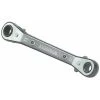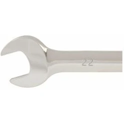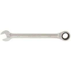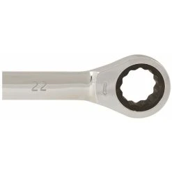 Hardened and tempered chrome vanadium metric spanner with mirror-polished finish. Chrome plated for corrosion resistance. 5° ratchet action. Provides easy access in tight spaces.