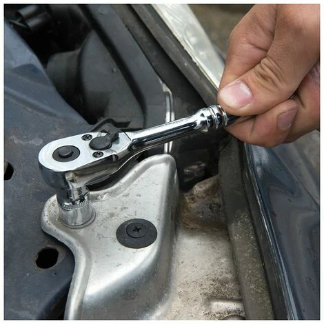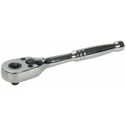 Slim, ergonomic, hardened and tempered chrome vanadium handle. Single-handed reversible ratchet mechanism and positive socket locking mechanism with single-handed push-to-release. Features tough Cro-Mo gears for high torque application and 72 teeth for fine, 5° ratchet action. Manufactured to DIN 3122.