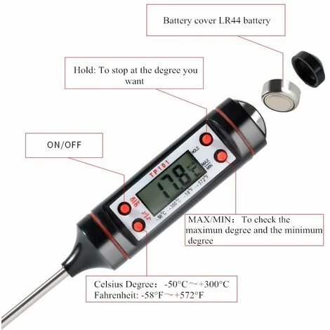 - Many convenient functions: It is a good cooking thermometer with display of current temperature, max and min value, temperature changes are recorded quickly. Hold function to display the measured value permanently on the screen. The HOLD function of the cooking thermometer is very useful when measuring hot liquids.