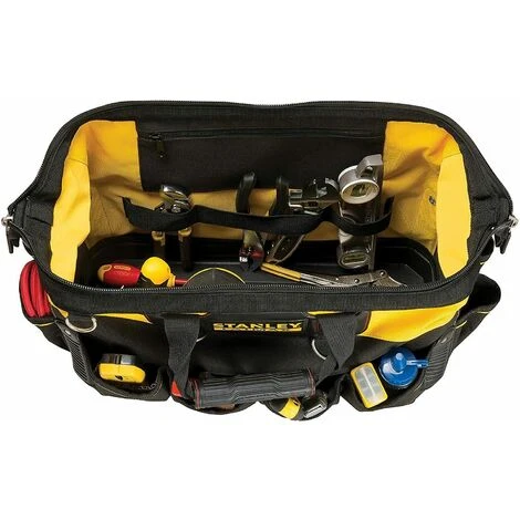 The Stanley 1-93-950 tool bag is made from extra-tough 600 x 600 denier fabric weave for durability. It has a waterproof base making it perfect for use on the job site. There is a variety of internal pockets and loops, ideal for standing individual tools upright around the perimeter of the bag. The ergonomic carry handles and heavy-duty shoulder strap make lifting more comfortable.