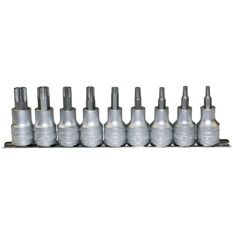 Set of 9 1/2 drive TPX bit sockets for internal TPX heads and for tamper proof screws supplied on a clip rail with a satin finish.