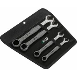 This 10mm Joker combination ratcheting wrench from Wera offers a unique holding function thanks to the metal plate in the jaw which reduces the risk of dropping nuts and bolts. The ratchet mechanism at the ring end enables the spanner to be used in very confined spaces.