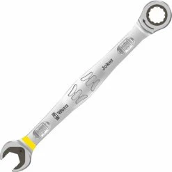 This 10mm Joker combination ratcheting wrench from Wera offers a unique holding function thanks to the metal plate in the jaw which reduces the risk of dropping nuts and bolts. The ratchet mechanism at the ring end enables the spanner to be used in very confined spaces.