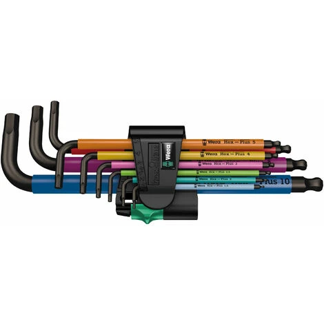 This set includes 9 metric L-keys from Wera with BlackLaser finish and Hex-Plus profile, designed for use with hexagonal socket screws. These keys are colour-coded for easy identification. Supplied in two-component clip.