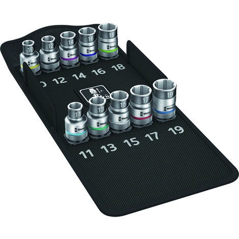 The sockets are colour coded dependent on the size for fast tool selection; part of the wider Wera size identification system. The set features secure ‘Twist-Lock tool retention for easy selection and safe storage in a structured textile pouch.