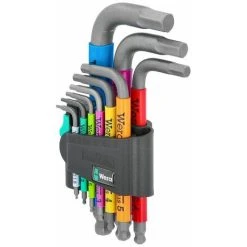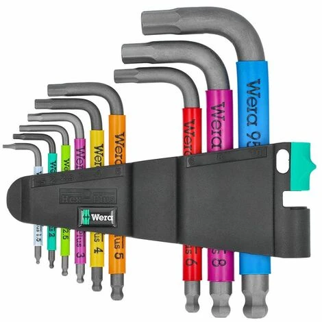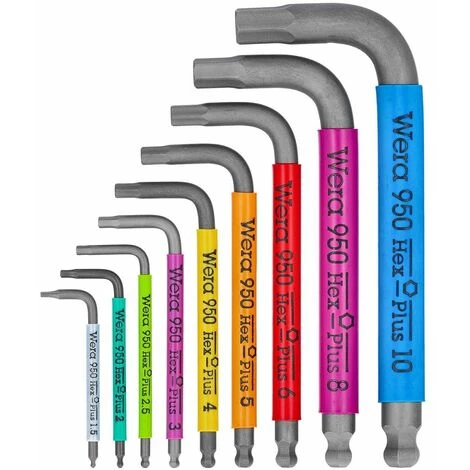 Wera 950/9 Hex-Plus L-Key Set with Wera’s patented Hex-Plus profile; that drives from the flats instead of the points, preventing the rounding out of screws, whilst allowing 20% further torque to be applied (Hex-Plus profile fits every standard hexagon socket head screw). The round bar design adds strength and robustness to the L-keys, particularly where smaller sizes are concerned.