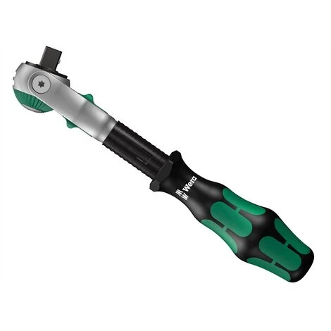 Wera Zyklop ratchet with innovative design handle which replaces up-to 5 ratchets in a tool kit. Fixed, swivel, quick release and fine tooth ratchet, with an adjustable head for setting offsets at 0°, 15° or 90°. At 0° it can be used like a conventional screwdriver and features a free rotating sleeve for fast turning in the in-line position. Locking the ratchet at 15° allows clearance from the workpiece or access to recessed nuts and when unlocked the ratchet can be used as a swivel handle for improved access.