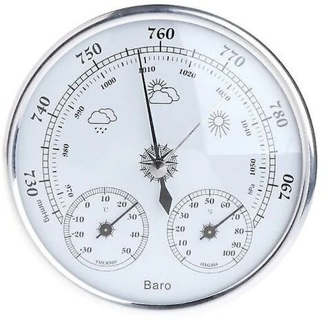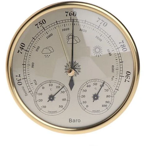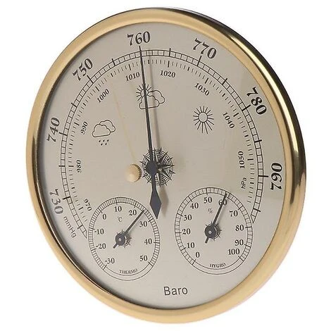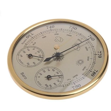 Descriptions: This product is used to measure the changes of the parameters of the temperature, humidty, atmospheric pressure. According to the variation tendency of the environment’s temperature, humidty and air pressure, it can predict the weather accurately. Thus, it can be a multifunctional household weather forecasting instrument.   Features: With barometer, thermometer and hygrometer, 3 in 1 multifunction, economical and practical Standard measuring range, predict the weather more accurately Lightweight and easy to install, suitable for hanging or placing on a surface Simple and elegant design make you more comfortable when using it   Specifications: Measurement Range: -30~50¡æ; 0~100%RH; 970~1050hPa Resolution£º1hPa, 1¡æ, 2%RH Accuracy: ¡À2¡æ£¬¡À5%RH(30~80%RH),¡À5hPa(970~1040hPa) Diameter: 13cm/5.12 Thickness: 4.1cm/1.61 Color:Golden Quantity: 1 Pc   Note: Please allow 1-3mm error due to manual measurement.pls make sure you do not mind before you bid Due to the difference between different monitors, the picture may not reflect the actual color of the item. Thank you   Package Contents: 1 x Thermometer Hygrometer Barometer
